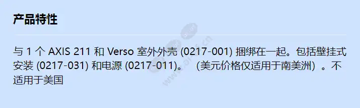 与 1 个 AXIS 211 和 Verso 室外外壳 (0217-001) 捆绑在一起。包括壁挂式安装 (0217-031) 和电源 (0217-011)。 (美元价格仅适用于南美洲)。不适用于美国