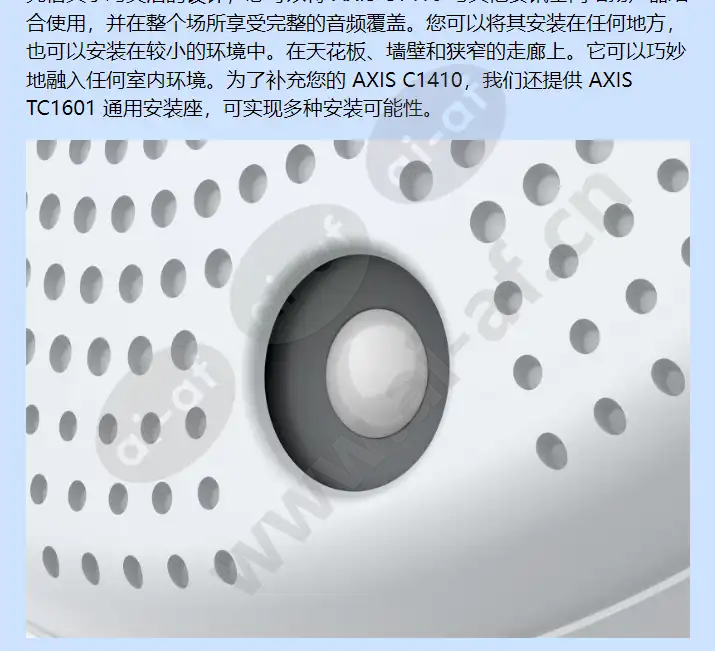 具有广域覆盖的扬声器用于语音留言 多合一扬声器系统 连接到标准网络 PoE轻松安装 远程健康测试 用于运动检测的PIR传感器 使用 AXIS C1410 网络迷你扬声器阻止不必要的活动并警告您的摄像机检测到的不良行为者。您还可以在需要时使用语音消息提供说明。 AXIS C1410 智能且易于集成,旨在巧妙地融入更小的空间。每台价格实惠的 AXIS C1410 均可提供大范围的音频覆盖,以保持较低的安装成本并使其成为具有成本效益的选择。 多合一轻松 AXIS C1410 是一体机。无需单独的功率放大器和信号处理器 (DSP)。预先配置的数字信号处理每次都能产生清晰的声音。板载内存支持预先录制的消息。或者,工作人员可以通过实时语音响应通知。得益于内置麦克风,AXIS C1410 还支持双向通信,让您可以立即获得相关人员的响应,例如确认您的指令、在需要时提供更多信息等。麦克风还可用于远程扬声器的健康测试,所以你知道它正在工作。 AXIS C1410 插入标准 IP 网络,因此无需特殊音频线。基于开放标准,易于与视频管理软件集成( VMS ), IP 语音 ( 网络电话 ) 电话 (使用 SIP ),以及来自 Axis 和我们合作伙伴的分析。我们的 AXIS Audio Manager Edge 应用程序预装在 AXIS C1410 上。它使您可以通过区域管理和内容调度等功能有效地管理和控制您的音频系统。 随处需要一个扬声器 凭借其小巧灵活的设计,您可以将 AXIS C1410 与其他安讯士网络扬声器结合使用,并在整个场所享受完整的音频覆盖。您可以将其安装在任何地方,也可以安装在较小的环境中。在天花板、墙壁和狭窄的走廊上。它可以巧妙地融入任何室内环境。为了补充您的 AXIS C1410,我们还提供 AXIS TC1601 通用安装座,可实现多种安装可能性。 降低成本 AXIS