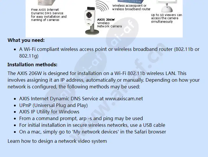 Features: Superior image quality using advanced video processing and the latest high quality, progressive scan CMOS image sensor, which works in light conditions down to 4 lux at 8 frames per second Up to 30 frames/sec in all resolutions ranging up to 640x480 Wireless operation via Wi-Fi compliant 802.11b (reach of up to 450 ft./150 m with clear line of sight) enables easy installation without the need for networking cables; hence, there is no port for an Ethernet cable Supports WEP encryption of 64 or 128 bits Support for WPA-PSK (WiFi Protected Access) security Built-in Web server enables use of a standard Web browser for viewing and management Up to 10 viewers can directly access the camera simultaneously Web product interface available in multiple languages: English, French, German