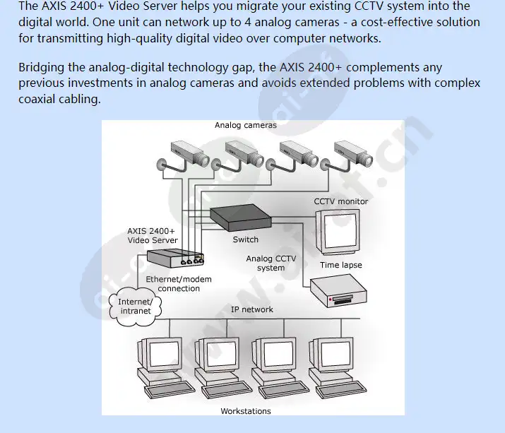 Features: Up to 4 analog video inputs Video stream: up to 30 (NTSC) or 25 (PAL) frames per second with Motion JPEG as well as single snapshot, user-controlled compression level 4 alarm inputs and 1 output signal Event handling including mail, TCP, HTTP and FTP notification and video upload Auto sensing for PAL and NTSC Support for multiple Pan/Tilt/Zoom devices Connection: Dial-up via modem as well as direct connection to Ethernet networks. PHP3 script support for developing your own application scripts Remote configuration and status using Web-based tools Three times more space for pre-and post alarm buffers than before: Allows the user to see extended video events in higher resolution and in greater detail - up to 12 MB available for alarm buffers. Enables higher level of customization: