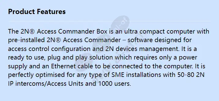The 2N® Access Commander Box is an ultra compact computer with pre-installed 2N® Access Commander – software designed for access control configuration and 2N devices management. It is a ready to use, plug and play solution which requires only a power supply and an Ethernet cable to be connected to the computer. It is perfectly optimised for any type of SME installations with 50-80 2N IP intercoms/Access Units and 1000 users.
