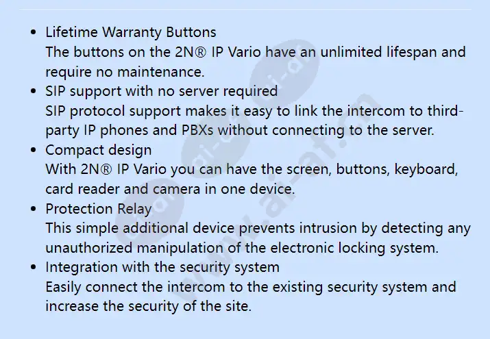 Door intercom with IP Connection Audio No camera 3 buttons, keypad IP Vario The IP Vario combines a sleek, stainless steel design with advanced technology. This variable intercom offers a variety of functions for visitor communication, access control and video surveillance. The many add-ins, such as the display, card reader or keyboard, allow for a wide range of applications. Characteristics Lifetime Warranty Buttons The buttons on the 2N® IP Vario have an unlimited lifespan and require no maintenance. SIP support with no server required SIP protocol support makes it easy to link the intercom to third-party IP phones and PBXs without connecting to the server. Compact design With 2N® IP Vario you can have the screen, buttons, keyboard, card reader and camera in one device. Protection Relay