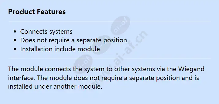 Connects systems Does not require a separate position Installation include module The module connects the system to other systems via the Wiegand interface. The module does not require a separate position and is installed under another module. Access Control Access control accessories