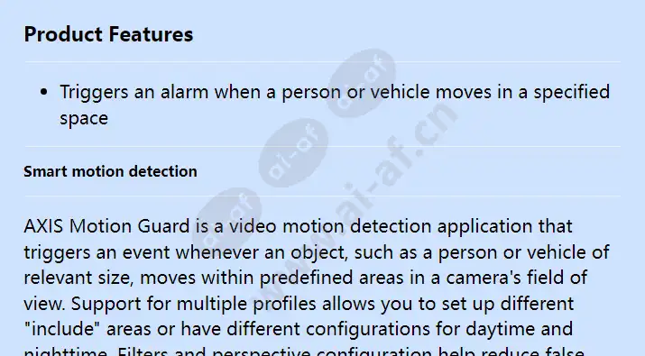 Triggers an alarm when a person or vehicle moves in a specified space Smart motion detection AXIS Motion Guard is a video motion detection application that triggers an event whenever an object, such as a person or vehicle of relevant size, moves within predefined areas in a camera's field of view. Support for multiple profiles allows you to set up different "include" areas or have different configurations for daytime and nighttime. Filters and perspective configuration help reduce false alarms. Alarm overlays in live or recorded video make clear what objects are triggering the alarms. AXIS Motion Guard is ideal for after-hours monitoring of office buildings, retail stores, industrial properties and vehicle depots. Key Features: Video motion detection Edge-based video analytics Multiple