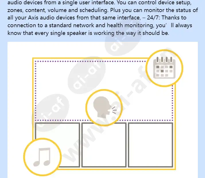 Audio management software license for installation on your own hardware Central control Zone management Scheduling System health monitoring Realtime configuration AXIS Audio Manager Pro is the perfect choice for larger sites (up to 5000 speakers and 100 zones) and more advanced audio installations. It comes with an unlimited number of licenses, so you are free to grow your business to meet your needs. AXIS Audio Manager Pro gives you the flexibility to install the software on the hardware of your choice or on a virtual machine. AXISAudio Manager Prowill be installed as a service in your operating system. Central control AXIS Audio Manager Pro lets you manage a large site and control all your audio devices from a single user interface. You can control device setup, zones, content, volume