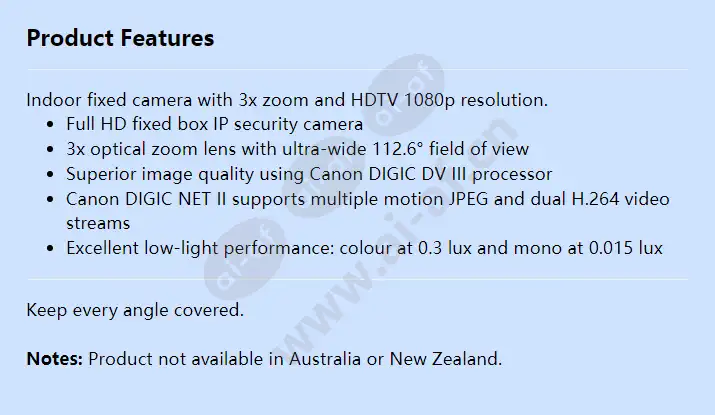 Indoor fixed camera with 3x zoom and HDTV 1080p resolution. Full HD fixed box IP security camera 3x optical zoom lens with ultra-wide 112.6° field of view Superior image quality using Canon DIGIC DV III processor Canon DIGIC NET II supports multiple motion JPEG and dual H.264 video streams Excellent low-light performance: colour at 0.3 lux and mono at 0.015 lux Keep every angle covered. Notes: Product not available in Australia or New Zealand.