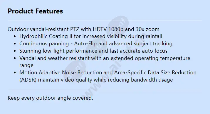 Outdoor vandal-resistant PTZ with HDTV 1080p and 30x zoom Hydrophilic Coating II for increased visibility during rainfall Continuous panning - Auto-Flip and advanced subject tracking Stunning low-light performance and fast accurate auto focus Vandal and weather resistant with an extended operating temperature range Motion Adaptive Noise Reduction and Area-Specific Data Size Reduction (ADSR) maintain video quality while reducing bandwidth usage Keep every outdoor angle covered.