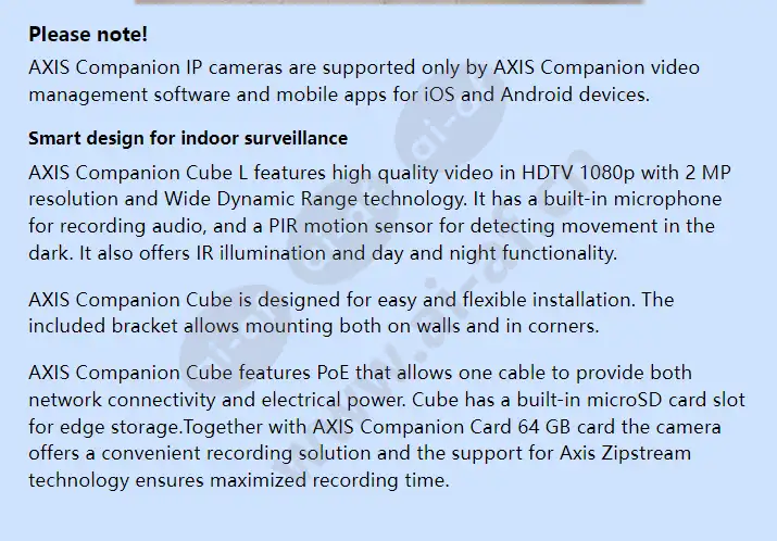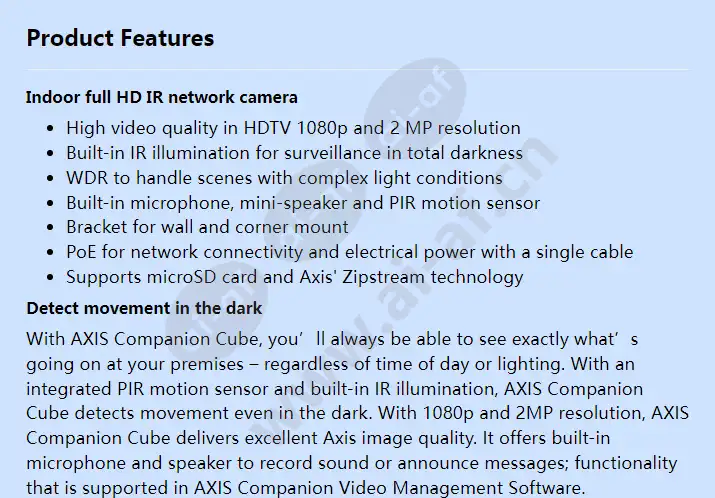 Indoor full HD IR network camera High video quality in HDTV 1080p and 2 MP resolution Built-in IR illumination for surveillance in total darkness WDR to handle scenes with complex light conditions Built-in microphone, mini-speaker and PIR motion sensor Bracket for wall and corner mount PoE for network connectivity and electrical power with a single cable Supports microSD card and Axis' Zipstream technology Detect movement in the dark With AXIS Companion Cube, you’ll always be able to see exactly what’s going on at your premises – regardless of time of day or lighting. With an integrated PIR motion sensor and built-in IR illumination, AXIS Companion Cube detects movement even in the dark. With 1080p and 2MP resolution, AXIS Companion Cube delivers excellent Axis image quality. It offers