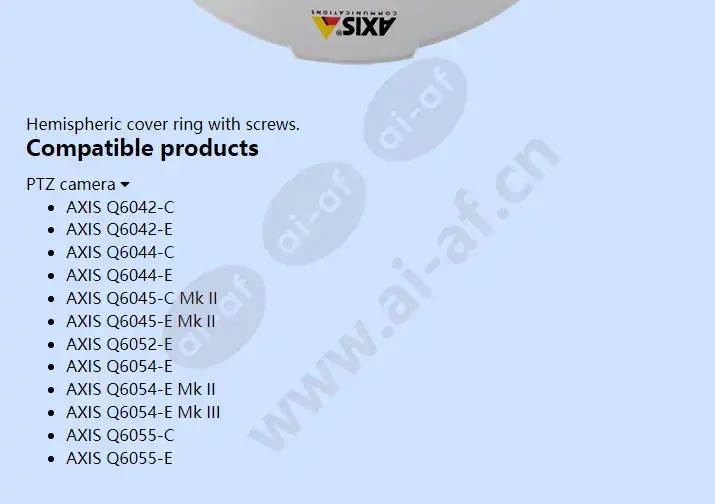 Hemispheric cover ring with screws. Compatible products PTZ camera AXIS Q6042-C AXIS Q6042-E AXIS Q6044-C AXIS Q6044-E AXIS Q6045-C Mk II AXIS Q6045-E Mk II AXIS Q6052-E AXIS Q6054-E AXIS Q6054-E Mk II AXIS Q6054-E Mk III AXIS Q6055-C AXIS Q6055-E