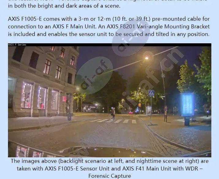 Robust design enables highly discreet indoor, outdoor and mobile surveillance Flexible, rugged design for indoor, outdoor and mobile use Fixed lens with 1080p resolution Wide 113° horizontal field of view Supports WDR – Forensic Capture (with AXIS F41/F44 Main Unit) The AXIS F1005-E sensor unit, together with the AXIS F main unit, is ideal for use in highly discreet indoor, outdoor and mobile surveillance applications. AXIS F1005-E can be discreetly installed in tight places, can be flush mounted on a wall or ceiling, or can be incorporated into a light bar on top of an emergency vehicle. The rugged IP66 rated sensor unit withstands dust, rain, snow, vibration, shock and temperature fluctuations. Flexible installation AXIS F1005-E comprises an image sensor with a 1080p resolution (1920 x