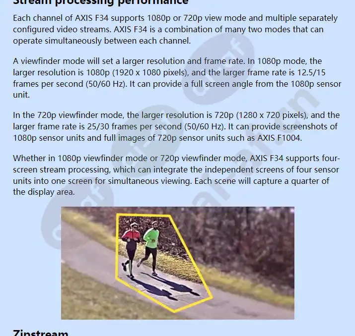 Simultaneously stream 1080p/HDTV 720p video from four sensor units Quad stream Axis’ Zipstream technology Two built-in SD card slots Multi-screen monitoring AXIS F34 Main Unit provides a cost-effective, highly discreet solution for four adjacent areas. The main unit should be placed indoors and can be connected to four different AXIS F Sensor Units. Sensor units can be installed in confined indoor locations or outdoor locations as far as 8, 12, or 15 meters (26, 39, or 49 feet), depending on whether the sensor unit and cable accessories support it. AXIS F34 is very suitable for use in small shops and offices and around ATMs (Automated Teller Machines). It is optimized for customers looking for a simple, flexible, and cost-effective multi-screen monitoring solution. Cost-effective