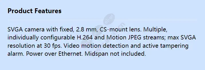 SVGA camera with fixed, 2.8 mm, CS-mount lens. Multiple, individually configurable H.264 and Motion JPEG streams; max SVGA resolution at 30 fps. Video motion detection and active tampering alarm. Power over Ethernet. Midspan not included.