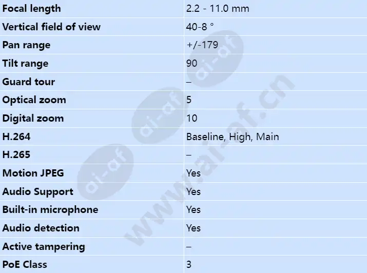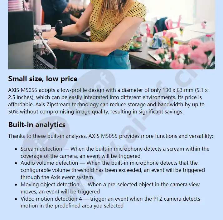 Please note: AXIS M5055 is not available in the United States, Canada and Japan Horizontal rotation, vertical rotation, zoom, 5x optical zoom HDTV 1080p Autofocus and WDR Built-in analytics Zipstream AXIS M5055 PTZ Network Camera series is a small palm-sized PTZ camera suitable for different positions. The camera is very suitable for smaller places, its price is affordable and it can present large images with important details. At a glance, the details are clear AXIS M5055 provides you with excellent detailed videos with a 71° horizontal field of view. PTZ function-with 5x optical zoom and auto focus, to provide you with a wide-range overview and high-quality magnification details. The full HDTV 1080p resolution ensures excellent image usability. Small size, low price AXIS M5055 adopts a