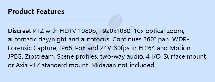 Discreet PTZ with HDTV 1080p, 1920x1080, 10x optical zoom, automatic day/night and autofocus. Continues 360° pan. WDR- Forensic Capture, IP66, PoE and 24V. 30fps in H.264 and Motion JPEG, Zipstream, Scene profiles, two-way audio, 4 I/O. Surface mount or Axis PTZ standard mount. Midspan not included.