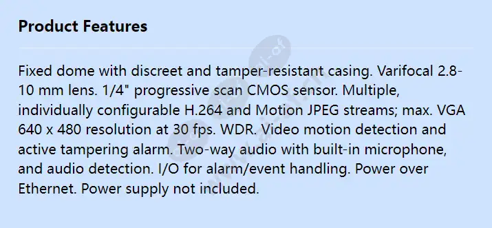 Fixed dome with discreet and tamper-resistant casing. Varifocal 2.8-10 mm lens. 1/4" progressive scan CMOS sensor. Multiple, individually configurable H.264 and Motion JPEG streams; max. VGA 640 x 480 resolution at 30 fps. WDR. Video motion detection and active tampering alarm. Two-way audio with built-in microphone, and audio detection. I/O for alarm/event handling. Power over Ethernet. Power supply not included.