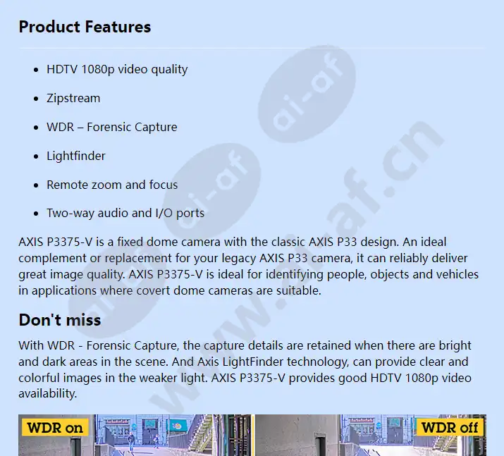 HDTV 1080p video quality Zipstream WDR – Forensic Capture Lightfinder Remote zoom and focus Two-way audio and I/O ports AXIS P3375-V is a fixed dome camera with the classic AXIS P33 design. An ideal complement or replacement for your legacy AXIS P33 camera, it can reliably deliver great image quality. AXIS P3375-V is ideal for identifying people, objects and vehicles in applications where covert dome cameras are suitable. Don't miss With WDR - Forensic Capture, the capture details are retained when there are bright and dark areas in the scene. And Axis LightFinder technology, can provide clear and colorful images in the weaker light. AXIS P3375-V provides good HDTV 1080p video availability. A camera you can trust AXIS P3375-V can provide remote zoom and focus for quick and easy