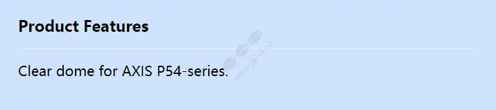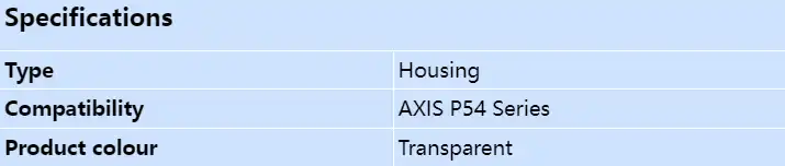 Clear dome for AXIS P54-series. Type Housing Product colour Transparent Compatibility AXIS P54 Series