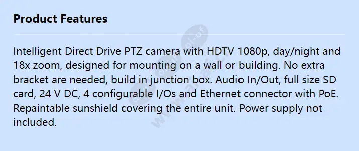 Intelligent Direct Drive PTZ camera with HDTV 1080p, day/night and 18x zoom, designed for mounting on a wall or building. No extra bracket are needed, build in junction box. Audio In/Out, full size SD card, 24 V DC, 4 configurable I/Os and Ethernet connector with PoE. Repaintable sunshield covering the entire unit. Power supply not included.