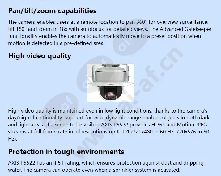 18x optical zoom with autofocus D1 resolution, day/night and H.264 IP51-rated protection against dust and dripping water Advanced Gatekeeper Easy installation including PoE+ (IEEE 802.3at) Easy-to-install PTZ dome for indoor video surveillance A PoE+ midspan is supplied with the camera. The indoor AXIS P5522 PTZ Dome Network Camera is affordably priced and easy to install. The camera is powered using Power over Ethernet Plus (PoE+), which facilitates installation since only one network cable is needed for carrying power, video/audio and PTZ commands. It is perfect for wide ranging surveillance applications, such as in stores, offices, hotels and warehouses. Pan/tilt/zoom capabilities The camera enables users at a remote location to pan 360° for overview surveillance, tilt 180° and zoom in