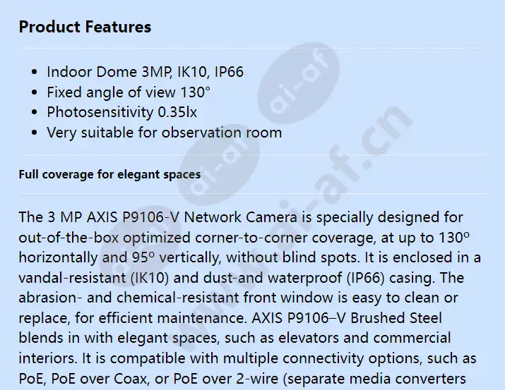 Indoor Dome 3MP, IK10, IP66 Fixed angle of view 130° Photosensitivity 0.35lx Very suitable for observation room Full coverage for elegant spaces The 3 MP AXIS P9106-V Network Camera is specially designed for out-of-the-box optimized corner-to-corner coverage, at up to 130º horizontally and 95º vertically, without blind spots. It is enclosed in a vandal-resistant (IK10) and dust-and waterproof (IP66) casing. The abrasion- and chemical-resistant front window is easy to clean or replace, for efficient maintenance. AXIS P9106–V Brushed Steel blends in with elegant spaces, such as elevators and commercial interiors. It is compatible with multiple connectivity options, such as PoE, PoE over Coax, or PoE over 2-wire (separate media converters required), to allow installation in environments