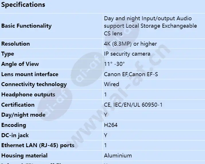 Indoor 20MP 8-25fps, Audio, I/O, SFP Fixed angle of view 15° Light sensitivity color 0.04lx mono 0.004lx, Outdoor enclosure available Professional photography meets video surveillance AXIS Q1659 offers an ultra-high image resolution for monitoring in exceptional details at 8 frames per second, achieving unprecedented levels of detail for observing open spaces and over long distances. It features digital reflexes with one lens (DSLR) image processing technology and offers a choice of Canon EF / EF-S lenses, depending on individual user needs. Equipped with an EF lens mount, the camera makes simple lens changes possible. AXIS Q1659 is compatible with a large number of video management systems, and it supports Zipstream that significantly reduces bandwidth and storage requirements.