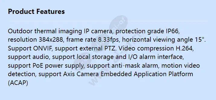 Outdoor thermal imaging IP camera, protection grade IP66, resolution 384x288, frame rate 8.33fps, horizontal viewing angle 15°. Support ONVIF, support external PTZ. Video compression H.264, support audio, support local storage and I/O alarm interface, support PoE power supply, support anti-mask alarm, motion video detection, support Axis Camera Embedded Application Platform (ACAP)