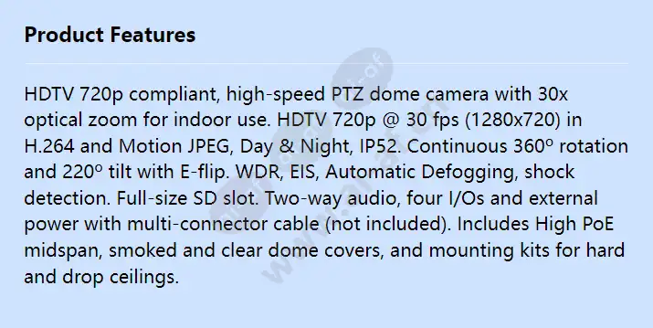 HDTV 720p compliant, high-speed PTZ dome camera with 30x optical zoom for indoor use. HDTV 720p @ 30 fps (1280x720) in H.264 and Motion JPEG, Day & Night, IP52. Continuous 360º rotation and 220º tilt with E-flip. WDR, EIS, Automatic Defogging, shock detection. Full-size SD slot. Two-way audio, four I/Os and external power with multi-connector cable (not included). Includes High PoE midspan, smoked and clear dome covers, and mounting kits for hard and drop ceilings.