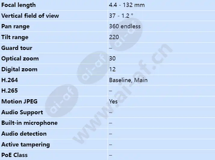 Marine grade stainless steel Shell suitable for pressurized nitrogen HDTV 720p and 30x optical zoom SFP fiber slot, RJ45 interface I/O for alarm input/output Stainless steel and nitrogen design for a wide range of applications AXIS Q6044-S is a high-speed surveillance camera with a pressurized marine-grade stainless steel housing. This sturdy and reliable camera has pan/tilt/zoom in/out functions, working uninterrupted throughout the day, with up to HDTV 720p clarity, 30x optical zoom through autofocus, 360° rotation and covering a wide area, Ensure better ability to zoom in on details. This highly durable outdoor dedicated camera with its stainless steel and pressurized nitrogen design makes it ideal for many applications. It is not only suitable for monitoring and remote control of