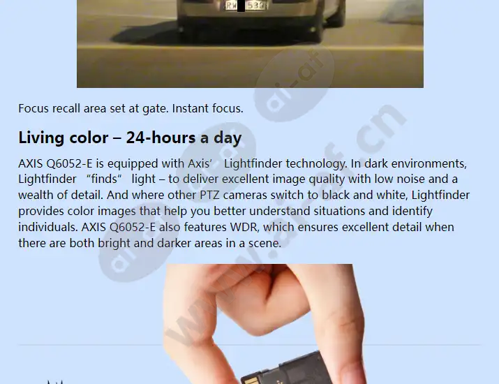 Axis’ Lightfinder technology D1 resolution and 36x optical zoom Focus recall Axis’ Zipstream technology IP66-rated protection against dust and dripping water For demanding conditions Sweeping overviews and zoomed-in detail. Instant focus and full-color footage –even in low light. AXIS Q6052-E is an advanced outdoor-ready PTZ dome that gives you all that. Designed for demanding conditions, it’s ideal for surveillance at airports, train stations, intersections, arenas, and parking lots – anywhere you need fast and precise, round-the-clock pan/tilt/zoom operation. In focus in an instant Focus recall helps you get more out of your AXIS Q6052-E in challenging light conditions. There’s no need to focus manually or wait the second or two it takes for autofocus to adjust. Focus recall gives you