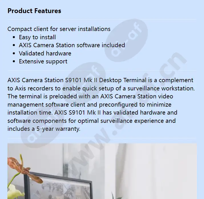 Compact client for server installations Easy to install AXIS Camera Station software included Validated hardware Extensive support AXIS Camera Station S9101 Mk II Desktop Terminal is a complement to Axis recorders to enable quick setup of a surveillance workstation. The terminal is preloaded with an AXIS Camera Station video management software client and preconfigured to minimize installation time. AXIS S9101 Mk II has validated hardware and software components for optimal surveillance experience and includes a 5-year warranty. Out-of-the-box ready AXIS S9101 Mk II is designed for quick installation. The workstation is preloaded with all necessary software including AXIS Camera Station video management software client to enable quick connection to the server. The integrated AXIS recorder