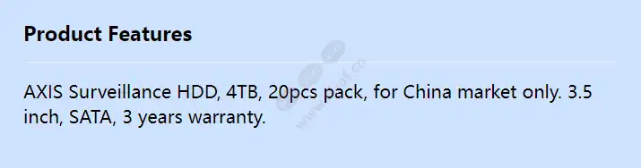AXIS Surveillance HDD, 4TB, 20pcs pack, for China market only. 3.5 inch, SATA, 3 years warranty.