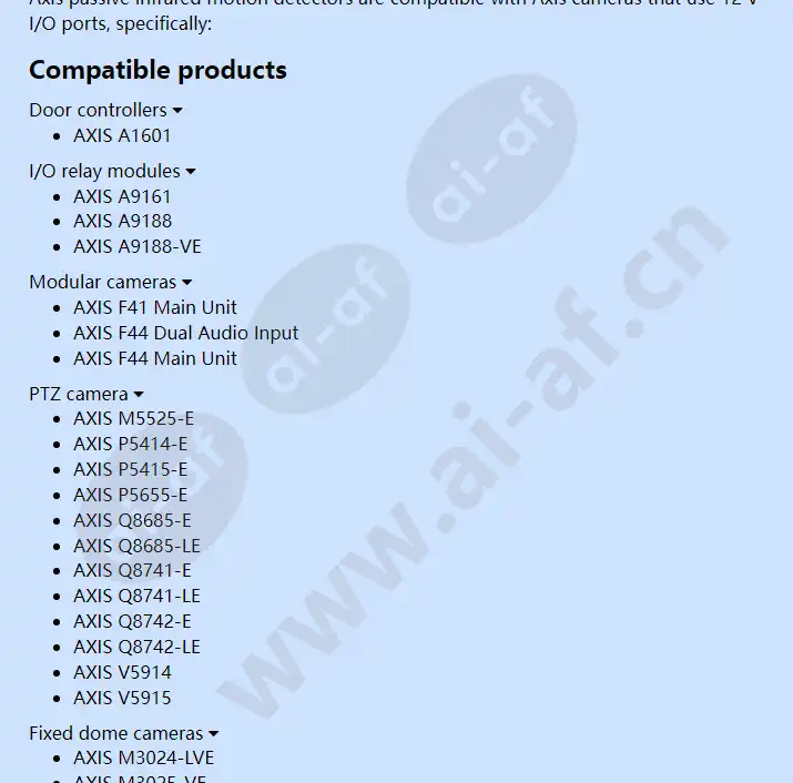 High quality passive infrared motion detector Easily connect to 12 V I/O ports Up to 12 meters (40 feet) detection One-cable connection Due to the built-in I/O connector (same as the connector of Axis cameras), the indoor AXIS T8331 PIR Motion Detector is specially designed for Axis cameras. Only a cable is needed to connect the detector to the camera quickly and easily. Flexible detection area This detector offers different installation possibilities and helps to aim the passive infrared at the area to be detected. The attached mounting bracket supports the standard tripod thread, and the camera bracket that supports the same thread can be used. Optional accessories AXIS T91A10 mounting kit (including a fixture and a bracket) helps to achieve precise leveling of the detector.