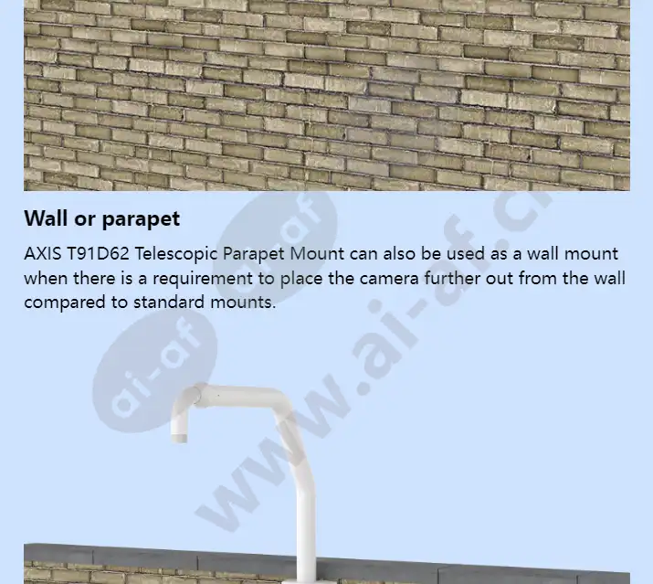 Parapet installation with telescopic flexibility Adjustable length, telescopic arm Swivel - easy to install and maintain Corrosion protected Installation flexibility: parapet and wall Made for any parapet Being the first telescopic parapet on the market, AXIS T91D62 Telescopic Parapet Mount helps installer to adjust the arm length of the mount. This is useful when the camera needs to see above thick parapets or any obstructive elements on the facade of the building. You can connect the Ethernet cable to an RJ45 connector grip at either end of the internal fish tape to pull the Ethernet cable through the pipe. Wall or parapet AXIS T91D62 Telescopic Parapet Mount can also be used as a wall mount when there is a requirement to place the camera further out from the wall compared to standard