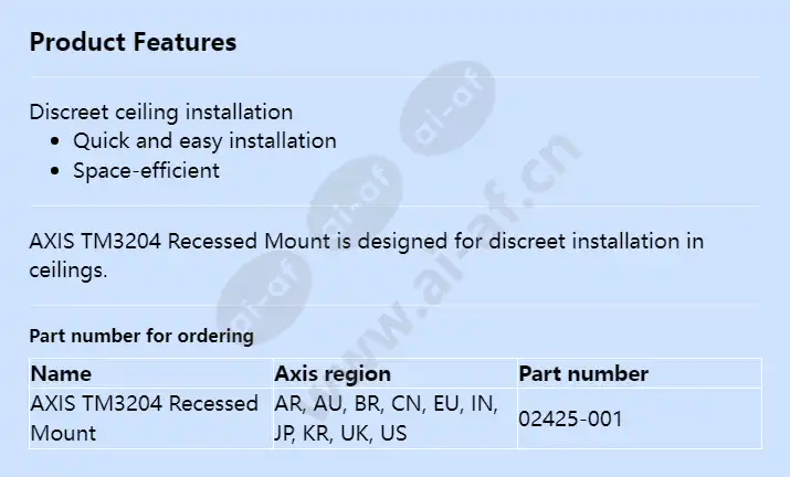 Discreet ceiling installation Quick and easy installation Space-efficient AXIS TM3204 Recessed Mount is designed for discreet installation in ceilings. Part number for ordering Name Axis region Part number AXIS TM3204 Recessed Mount AR, AU, BR, CN, EU, IN, JP, KR, UK, US 02425-001 Mounting Brackets Drop Ceiling Mount