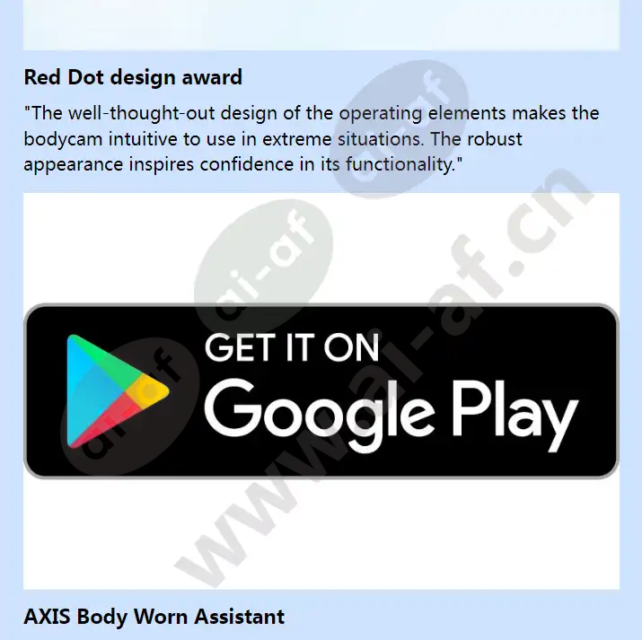 Made with you in mind WDR Dual mics for noise suppression Battery life of over 12 hours Klick Fast System Free mobile app AXIS W100 Body Worn Camera is an easy-to-use, lightweight and robust body worn camera that lets you store and manage video your way. It plugs right into your own Axis system or another system of your choice. Becomes a part of your system AXIS W100 Body Worn Camera is based on open standards for flexibility and scalability. You can use it with your current Axis solution. We can provide you with a complete end-to-end solution that includes AXIS Camera Station VMS. Or you can use AXIS W100 Body Worn Camera with a third-party VMS or EMS, either on-site or in the cloud. Either way, you decide how you want to manage your video evidence – while protecting the value of your