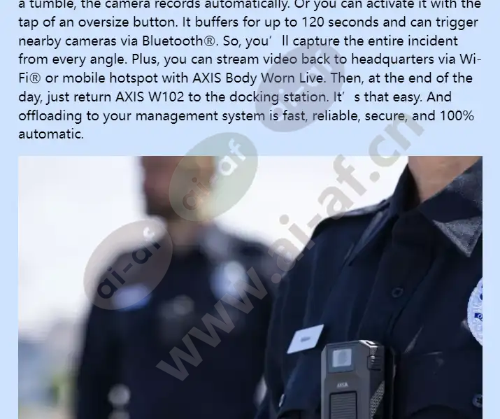 Robust and reliable for operational agility Always sharp images Excellent sound quality Long battery life Supports live streaming Multiple layers of encryption AXIS W102 Body Worn Camera empowers and protects officers and guards with effortless support and excellent forensic evidence all day. Get a new end-to-end Axis solution, or use an existing Axis solution, or a third-party VMS or EMS. It’s your choice. AXIS W102 has your back – all day When the shift starts, use the self-assign option, or grab a preassigned camera, mount it wherever you like, and go. If you draw a weapon or take a tumble, the camera records automatically. Or you can activate it with the tap of an oversize button. It buffers for up to 120 seconds and can trigger nearby cameras via Bluetooth®. So, you’ll capture the
