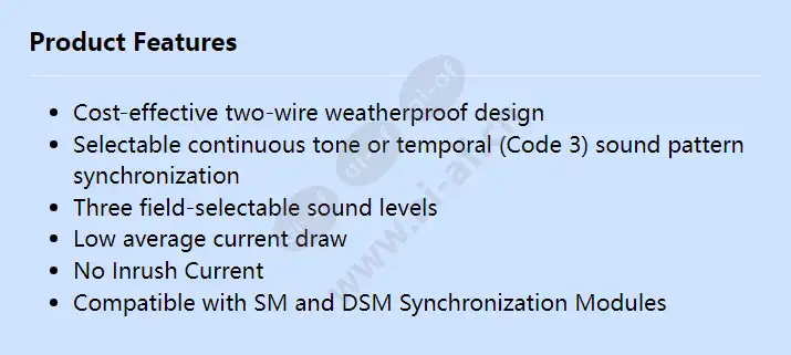 Cost-effective two-wire weatherproof design Selectable continuous tone or temporal (Code 3) sound pattern synchronization Three field-selectable sound levels Low average current draw No Inrush Current Compatible with SM and DSM Synchronization Modules Material Plastic Nominal voltage (VDC) 24 VDC Operating temperature (°C) 0 – 49 °C