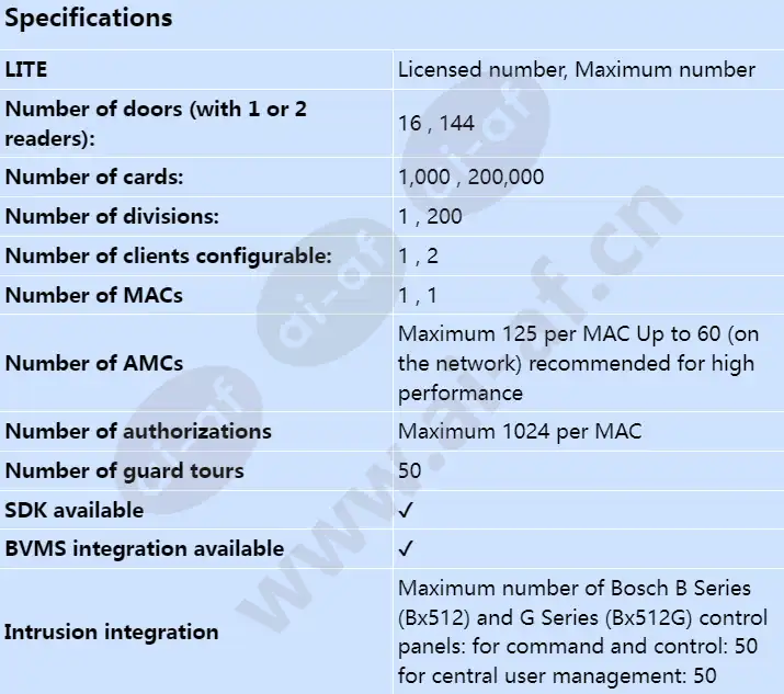 Combines high-end access control features, performance and availability with intuitive operation. Highly scalable: From 1,000 to 400,000 users, and from 32 to 10,000 doors. Easy to use: Intuitive GUI for maps and alarm viewer, and web-based visitor management. Easy to configure: Pre-packaged licenses, simple installation and set-up. Comprehensive security management: Integrates with intrusion and video systems. Robust and Secure: Multi-level architecture for system reliability, comprehensive data security and privacy protection. LITE Licensed number, Maximum number Number of doors (with 1 or 2 readers): 16 , 144 Number of cards: 1,000 , 200,000 Number of divisions: 1 , 200 Number of clients configurable: 1 , 2 Number of MACs 1 , 1 Number of AMCs Maximum 125 per MAC Up to 60 (on the