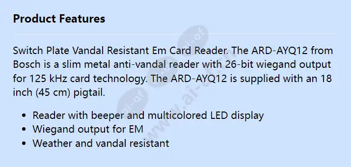 Switch Plate Vandal Resistant Em Card Reader. The ARD-AYQ12 from Bosch is a slim metal anti-vandal reader with 26-bit wiegand output for 125 kHz card technology. The ARD-AYQ12 is supplied with an 18 inch (45 cm) pigtail. Reader with beeper and multicolored LED display Wiegand output for EM Weather and vandal resistant