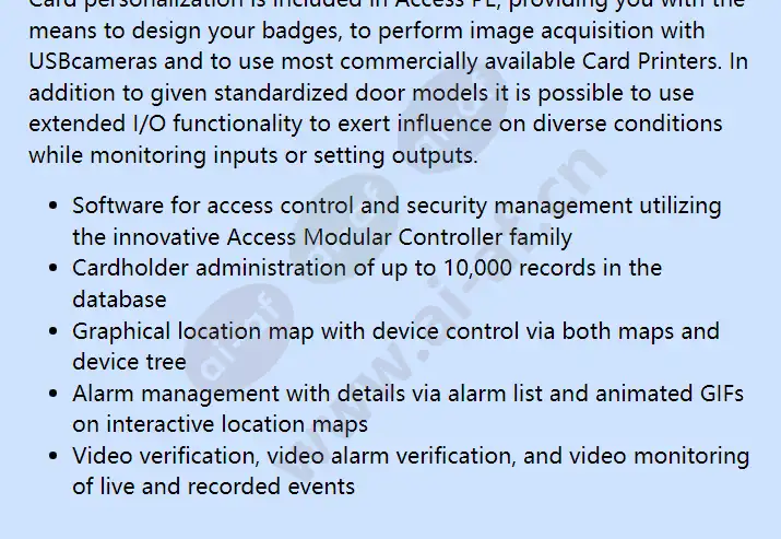 Access PE Extended License Software Comes With 64 Readers, 3 Client Connections And 10,000 Cardholders. System Expansion Is Available Through The Licensing Options. Access PE provides self contained access control for small and medium-sized companies. Its installation is extremely simple and fast. There is no need to install and administer a database system. The system is easy to use and enables a person with minimal training to create badges and administer access rights in a very short time. Specific event logging and reporting allows you to trace who was when and where on your company's grounds. You can choose your readers and cards from the same bundle of devices, which are supported by Bosch’s medium to large scale BIS/ACE Access Engine systems, thereby safeguarding your investment