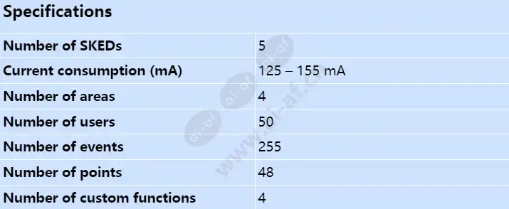 Provides up to 48 points using a combination of hardwired or wireless points for installation flexibility and up to 4 areas with perimeter and interior control On-board Ethernet port for Conettix IP alarm communication and remote programming, compatible with modern IP networks including IPv6/IPv4, Auto-IP, and Universal Plug and Play Installer-friendly features for simple installation and communications, including plug-in PSTN and cellular communication modules Programmable keypad shortcuts, situation sensitive on-screen help, and a bilingual user interface make system operation simple and easy Current consumption (mA) 125 – 155 mA Number of areas 4 Number of custom functions 4 Number of events 255 Number of points 48 Number of SKEDs 5 Number of users 50