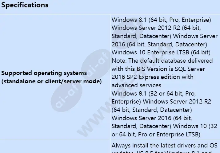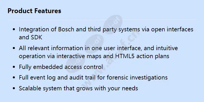 Integration of Bosch and third party systems via open interfaces and SDK All relevant information in one user interface, and intuitive operation via interactive maps and HTML5 action plans Fully embedded access control Full event log and audit trail for forensic investigations Scalable system that grows with your needs Supported operating systems (standalone or client/server mode).Installations of BIS on other operating systems may succeed, but are entirely without warranty. Windows 8.1 (64 bit, Pro, Enterprise) Windows Server 2012 R2 (64 bit, Standard, Datacenter) Windows Server 2016 (64 bit, Standard, Datacenter) Windows 10 Enterprise LTSB (64 bit) Note: The default database delivered with this BIS Version is SQL Server 2016 SP2 Express edition with advanced services