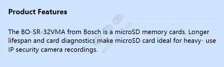 The BO-SR-32VMA from Bosch is a microSD memory cards. Longer lifespan and card diagnostics make microSD card ideal for heavy- use IP security camera recordings.