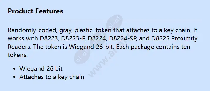 Randomly-coded, gray, plastic, token that attaches to a key chain. It works with D8223, D8223-P, D8224, D8224-SP, and D8225 Proximity Readers. The token is Wiegand 26-bit. Each package contains ten tokens. Wiegand 26 bit Attaches to a key chain