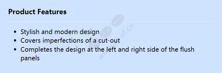 Stylish and modern design Covers imperfections of a cut-out Completes the design at the left and right side of the flush panels Color Black Color in RAL RAL 9017 Traffic black Dimensions (H x W x D) (mm) 20 x 56 x 5.50 mm Weight (g) 2 g