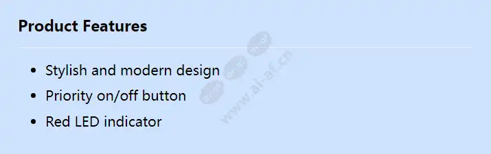 Stylish and modern design Priority on/off button Red LED indicator Dimensions (H x W x D) (in) 2.20 x 2 x 1.80 in Dimensions (H x W x D) (mm) 56 x 50 x 46 mm Operating relative humidity, non-condensing (%) 5 – 90 % Operating temperature (°C) 5 – 45 °C Operating temperature (°F) 41 – 113 /F Storage temperature (°C) -5 – 45 °C Storage temperature (°F) 23 – 113 /F Weight (g) 43 g Weight (lb) 0.09 lb