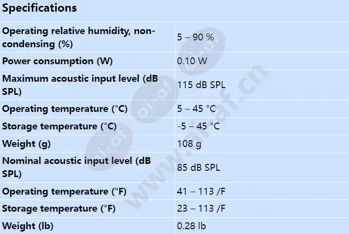 Uni-directional microphone on adjustable stem Built-in plop and windshield Low susceptibility to mobile phones Screw lock robust connection Maximum acoustic input level (dB SPL) 115 dB SPL Nominal acoustic input level (dB SPL) 85 dB SPL Operating relative humidity, non-condensing (%) 5 – 90 % Operating temperature (°C) 5 – 45 °C Operating temperature (°F) 41 – 113 /F Power consumption (W) 0.10 W Storage temperature (°C) -5 – 45 °C Storage temperature (°F) 23 – 113 /F Weight (g) 108 g Weight (lb) 0.28 lb