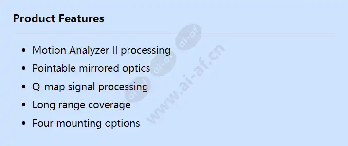 Motion Analyzer II processing Pointable mirrored optics Q-map signal processing Long range coverage Four mounting options Alarm relay contact type NC/NO Detection radius (m) 60 m Dimensions (H x W x D) (mm) 146 x 95 x 63.50 mm Input voltage (VDC) 6 – 15 VDC Installation height (m) 2 – 2.60 m Operating temperature (°C) -40 – 49 °C Tamper relay contact type NC