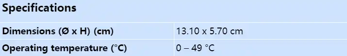360°by 20 m (65.6 ft) coverage Automatic supervision of radio link Low power consumption Highly sensitive to moving infrared radiation Immunity to Radio Frequency Interference (RFI), vibration, static, lightning, and ambient temperature changes Advanced digital signal processing Attack-resistant cover Long battery life Exclusive wireless protocol ensures maximum performance and reliability Dimensions (Ø x H) (cm) 13.10 x 5.70 cm Operating temperature (°C) 0 – 49 °C
