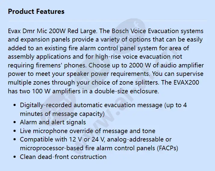 Evax Dmr Mic 200W Red Large. The Bosch Voice Evacuation systems and expansion panels provide a variety of options that can be easily added to an existing fire alarm control panel system for area of assembly applications and for high-rise voice evacuation not requiring firemens' phones. Choose up to 2000 W of audio amplifier power to meet your speaker power requirements. You can supervise multiple zones through your choice of zone splitters. The EVAX200 has two 100 W amplifiers in a double-size enclosure. Digitally-recorded automatic evacuation message (up to 4 minutes of message capacity) Alarm and alert signals Live microphone override of message and tone Compatible with 12 V or 24 V, analog-addressable or microprocessor-based fire alarm control panels (FACPs) Clean dead-front